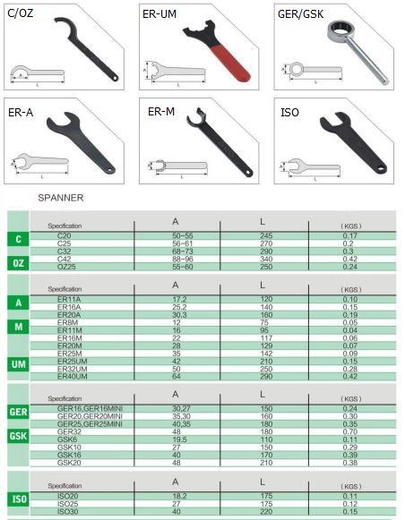 انواع آچار که برای انواع مهره کولت ER استفاده میشوند عبارتند از: