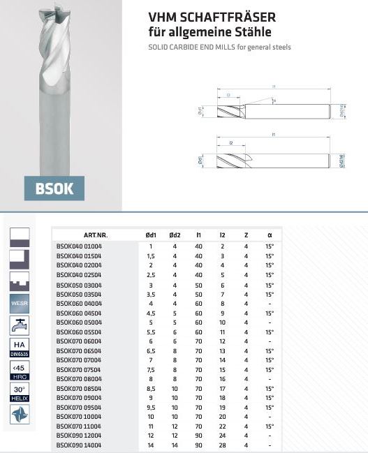 (چهار پر، با طول استاندارد برای ماشینکاری مواد تا سختی HRC45):